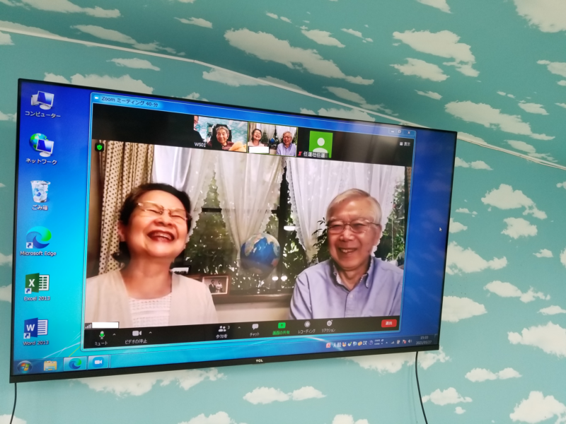 任運社では大変心苦しいのですが面会については「看取り状態」以外では「窓越し」か「オンライン」に限らせていただいています。どこの部屋からでもWifi電波を利用できますのでベッドの上からでも利用できます。しかし少しでもお互いの表情が分かるようにできればとのことで、別棟に65インチの大型テレビを設置し、静かな環境で利用していただいています。画面も音量も大きい方が利用者の方にはわかりやすいようです。このご家族も定期的にズームでの利用をされています。ご家族の皆さんお気軽にお申し出ください。