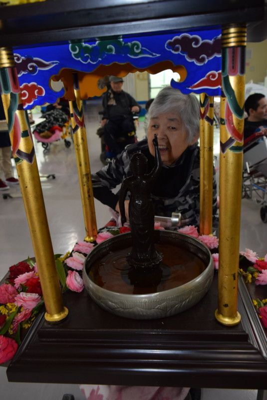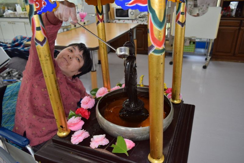 4月8日に、騰々舎の食堂にて、お釈迦様の誕生日を祝う花祭り(甘茶祭り)を行いました。お御堂の中には、誕生仏の銅像があり、その誕生仏に柄杓でお茶をかけ、底部に滴り落ちたお茶を頂きました。