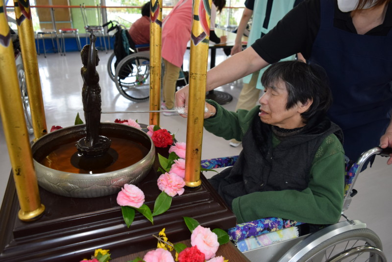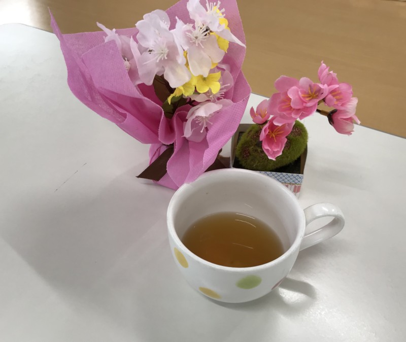 お茶は、三浦栄養士さんが、この日のために特製の甘茶を用意してくれました。花飾りを楽しみながら、お菓子と一緒に美味しく頂きました。