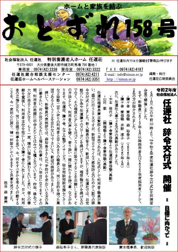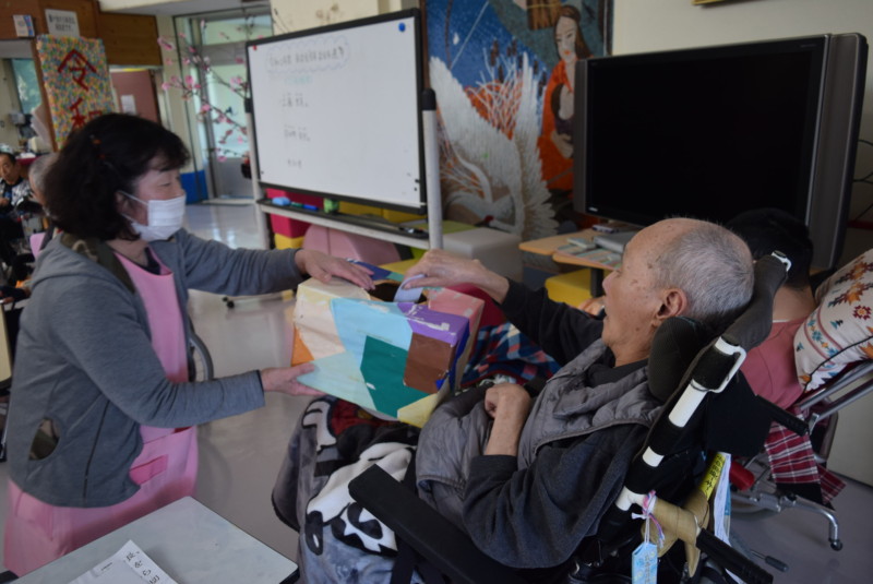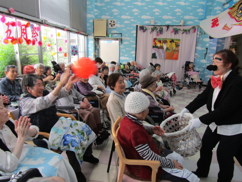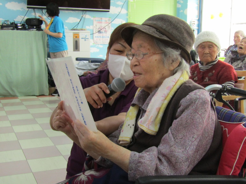 任運荘では高橋みのり寮母が10年勤続が表彰され、利用者を代表して羽田野キミ子さんが、感謝の気持ちとこれからも体に気を付けて頑張ってくださいと挨拶されました。お楽しみ会では、職員がピエロや加トちゃんに扮し、様々なアトラクションで利用者に楽しんでいただきました。