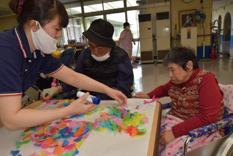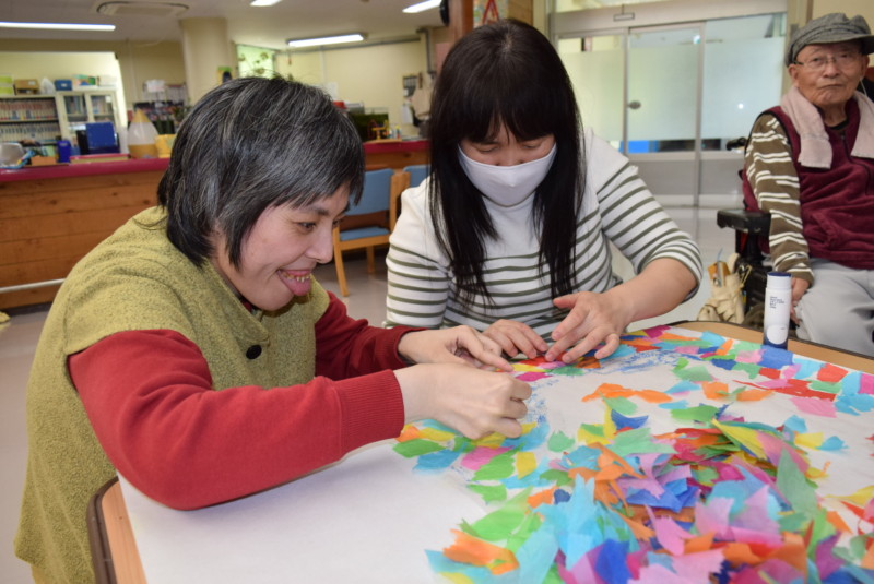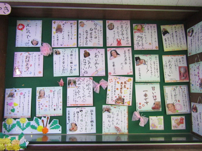 「掲示板の掲示物制作を行ってきました。できないところは職員さんに手伝っていただきました。これからも体調に合わせてボチボチやっていきたいと思います。」