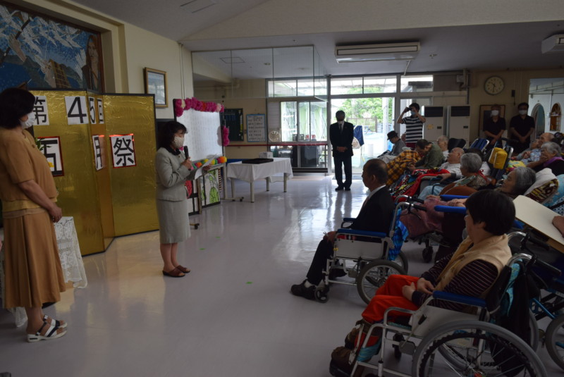 騰々舎ではデイルームにて式典を行いました。永年勤続表彰者は佐藤裕子元主任相談員(40年)、甲斐哲子寮母主任(30年)、工藤奈々主任サービス管理責任者(20年)、森岡愛子寮母(10年)、宮崎沙弥香寮母(10年)の5人です。自治会より甲斐修会長が長年の労をねぎらわれた後、受賞者を代表して佐藤裕子元主任相談員が謝辞を述べました。今年は模擬店がありませんでしたが、吉田施設長が会場で焼そばをを焼き、厨房からはレタス巻きやお好み串、いなり寿司等が行事食としてにぎわいに花を添えました。